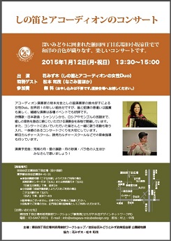 日時:2015年1月12日(月・祝日) 13:30~15:00 出 演:花みず木 ( しの笛とアコーディオンの女性Duo) 特別ゲスト:松本 和茂 (なごみ笛ほか) 参加費: 無 料 (お申し込みは不要です。直接会場へお越しください。) 会場:瀬田四丁目広場旧小坂邸 住所:東京都世田谷区瀬田4-41-21 (アクセス・地図へ) |