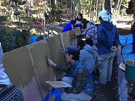 瀬田四丁目広場の緑地の南側にある「裏門」は、一文字桟瓦葺き切妻屋根をもつ四脚門形式と言われる門です。造られたのは、昭和13 年頃。今年度、世田谷区ではもっと多くの方に瀬田四丁目広場を利用していただくために、広場の緑地を整備し、この「裏門」の修復工事を行っています。そこでこの機会に、プロの左官職人さんに土壁の塗り方を教えてもらう、体験イベントを開催します。土壁の材料や構造、塗り方などについて教えていただき、参加者のみなさんも実際にコテを使って土壁塗りに挑戦してみましょう!