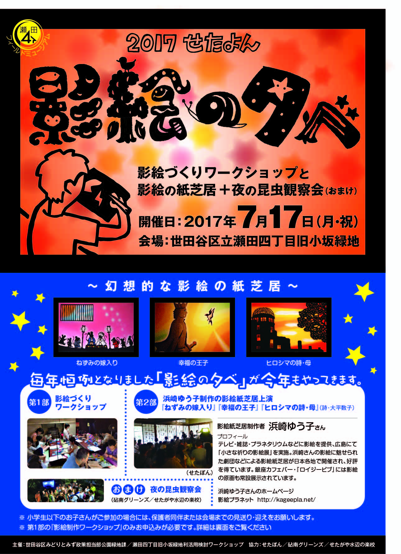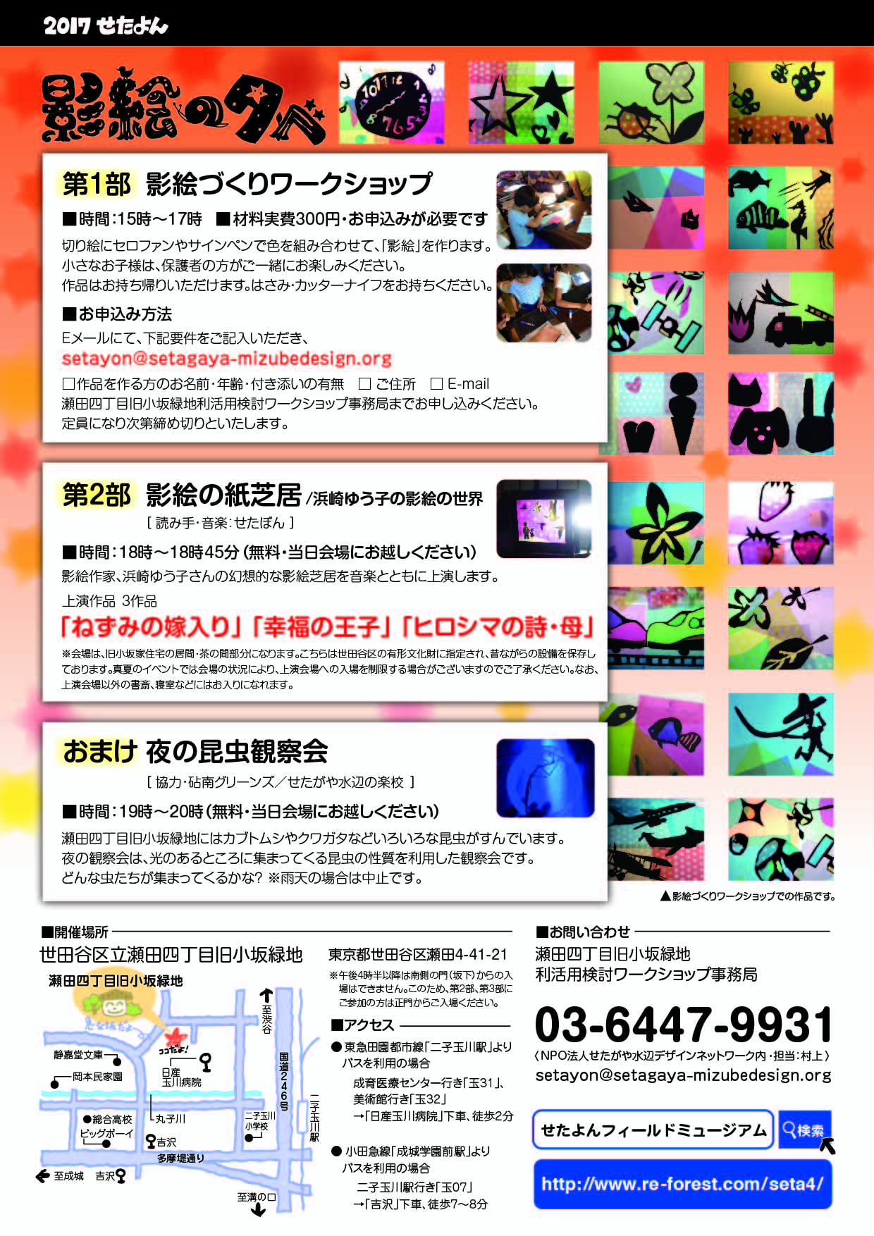 | ◇第1部◇ 影絵づくりワークショップ ※定員となりましたので、お申し込み締め切りいたしました。 ※参加ご希望の方はお申込が必要です 時間:15時から17時 参加費:300円(材料実費) 持ち物:はさみ・カッターナイフ 定員:申し込み先着25名 切り絵にセロファンやサインペンで色を組み合わせて、「影絵」を作ります。 小さなお子様は、保護者の方がご一緒にお楽しみください。作品はお持ち帰りいただけます。 ※幼児は第1部より保護者の同伴をお願いします。 お申し込みへ ◇第2部◇ 影絵の紙芝居 影絵作家、浜崎ゆう子さんの幻想的な影絵芝居を音楽とともに上演します。 上演作品「ねずみの嫁入り」、「幸福の王子」、「ヒロシマの詩・母」の3 作品です。 読み手・音楽:せたぼん 参加費:無料 時間:18時から18時45分 ※当日直接会場にお越しください。 ※会場は、旧小坂家住宅の居間・茶の間部分になります。こちらは世田谷区の有形文化財に指定され、昔ながらの設備を保存しております。真夏のイベントでは会場の状況により、上演会場への入場を制限する場合がございますのでご了承ください。なお、上演会場以外の書斎、寝室などにはお入りになれます。 ※小学生以下のお子様がご参加の場合には、保護者の同伴(会場への送迎)をお願いいたします。 ★おまけ★夜の昆虫観察会 瀬田四丁目旧小坂緑地にはカブトムシやクワガタなどいろいろな昆虫がすんでいます。夜の観察会は、光のあるところに集まってくる昆虫の性質を利用した観察会です。どんな虫たちが集まってくるかな?※雨天の場合は中止です。 時間:19時~20時 参加費:無料 雨天:中止 ※ お申し込みは必要ありません。 ※小学生以下のお子様がご参加の場合には、保護者の同伴(会場への送迎)をお願いいたします。 ※午後4時半以降は南側の門(坂下)からの入場はできません。このため、第2部、第3部にご参加の方は正門からご入場ください 協力・砧南グリーンズ/せたがや水辺の楽校 お問い合わせ・第1部:お申込み先: 下記宛てにメールでお申し込みください。 (定員となりましたので、お申し込み締め切りいたしました。) 瀬田四丁目旧小坂緑地活用検討ワークショップ事務局(NPO法人せたがや水辺デザインネットワーク内) E-Mail:setayon@setagaya-www2.mizubedesign.org 担当:村上 電話:03-6447-9931 |