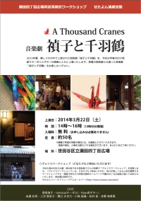 ※2月上旬発売予定の「母の友」3月号の特集記事『戦争は知らないけれど』で、『禎子と千羽鶴』の瀬田4丁目広場での公演を2月11日とご案内しましたが、3月22日に変更となりました。