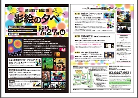 | ◇第1部◇ 影絵づくりワークショップ 切り絵にセロファンやサインペンで色を組み合わせて、「影絵」を作ります。(影絵制作指導:真木智子) 小さなお子様は、保護者の方がご一緒にお楽しみください。作品はお持ち帰りいただけます。 使用する部屋の大きさ、材料の関係から定員(25名)で締め切らせていただきます。参加ご希望の方はお早めにお申し込みください。 ※定員に達しました時点で締め切りとさせていただきます。あしからずご了承ください。 参加費:300円(材料実費) 時間:15時から17時 持ち物:はさみ・カッターナイフ 定員:申し込み先着25名 ※幼児は第1部より保護者の同伴をお願いします。 ※参加ご希望の方はお申込が必要です。 お申込み方法: 電話またはE メールにて、下記要件をお知らせ(ご記入)いただき、瀬田四丁目広場利活用検討ワークショップ事務局までお申し込みください。 定員になり次第締め切りといたします。 □ 作品を作る方のお名前・年齢・付き添いの有無 □ ご住所 □ 電話番号またはE-mail ![]() ◇第2部◇ 浜崎ゆう子の影絵の紙芝居 上演作品「ねずみの嫁入り」、「幸福の王子」 参加費:無料 時間:18時から18時45分 お申込みは必要ありません。 ※どなたでもご覧いただけますが、当日の開場の状況により、影絵紙芝居会場へのご入場をお断わりする場合もございます。その際も、上演会場以外の邸内の書斎などにはお入りになれます。 快適な鑑賞のためにご協力ください。 ★おまけ★ せたよんナイトサファリ〜夜の昆虫観察会〜(協力・砧南グリーンズ・水辺の楽校) 時間:19時〜20時 参加費:無料 ※ お申し込みは必要ありません。 ※雨天の場合、ナイトサファリは中止となります。 ※2部および、おまけ に小学生以下のお子様がご参加の場合には、保護者の同伴(会場への送迎)をお願いいたします。 ※午後4時半以降は南側の門(坂下)からの入場はできません。このため、第2部、第3部にご参加の方は正門からご入場ください ![]() お問い合わせ・第1部:お申込み先: 瀬田4丁目広場利活用検討ワークショップ事務局 E-mail:info@setagaya-www2.mizubedesign.org 電話:03-6447-9931(せたがや水辺デザインネットワーク内・担当 村上) ★この活動は『平成26年度世田谷区の地域の絆ネットワーク支援事業』の補助を受けています。 主催:世田谷区みどりとみず政策担当部 公園緑地課/瀬田四丁目広場利活用検討ワークショップ事務局 協力:せたぼん・砧南グリーンズ・せたがや水辺の楽校 |