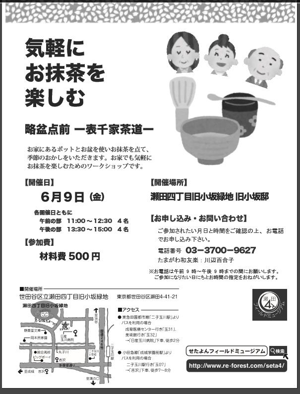 | 6月9日(金) ①11:00~12:30 4名 ②13:30~15:00 4名 申込みは日にちと時間をお願いします。 ■お申込み・お問い合わせ: 電話:03-3700-9627 (たまがわ和友楽・川辺百合子) (お電話は午前9時~午後9時までの間にお願いします。) |
