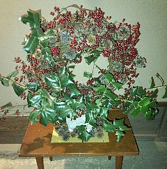 小坂邸の柊や松笠でクリスマスリースを作りました。玄関に置きました。 |