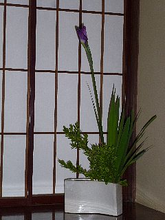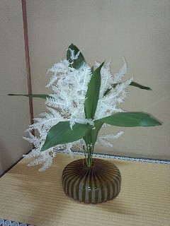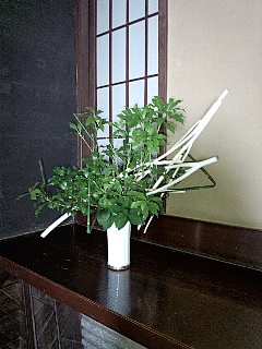 よく来る御近所の女の子達とコラボしました。二人とも生け花は初めて。とても楽しんでいました。白い晒しシダを子供達に生けてもらいました。なかなかの出来でしょう!? |