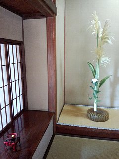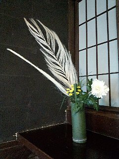 | 床の間の左手の付け書院の所には、杯に菊を浮かべて飾りました。 | |